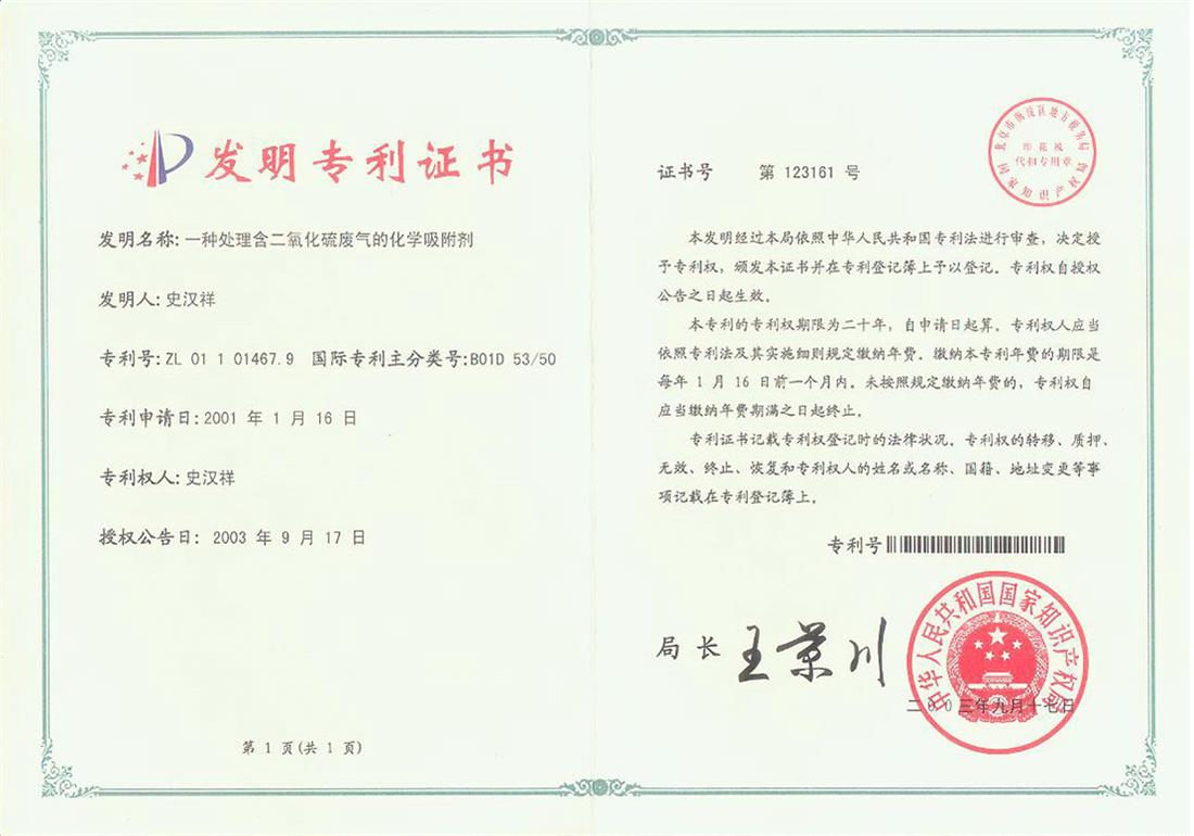 一種處理含SO2廢氣的化學(xué)吸附劑ZL01101467.9