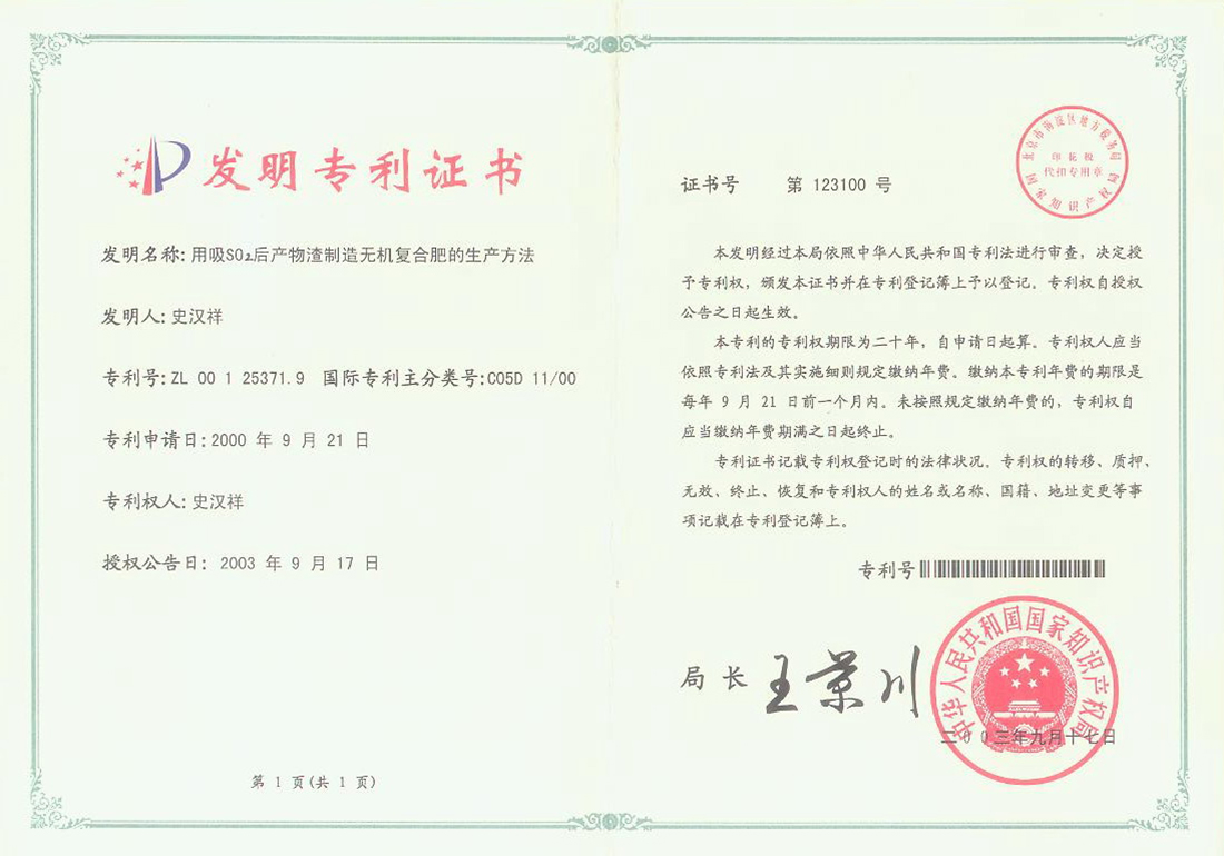 用吸收SO2后產(chǎn)物渣制造無機復(fù)合肥的生產(chǎn)方法ZL00125371.9