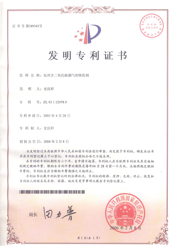 處理含SO2煙氣的吸收劑ZL03122078.9